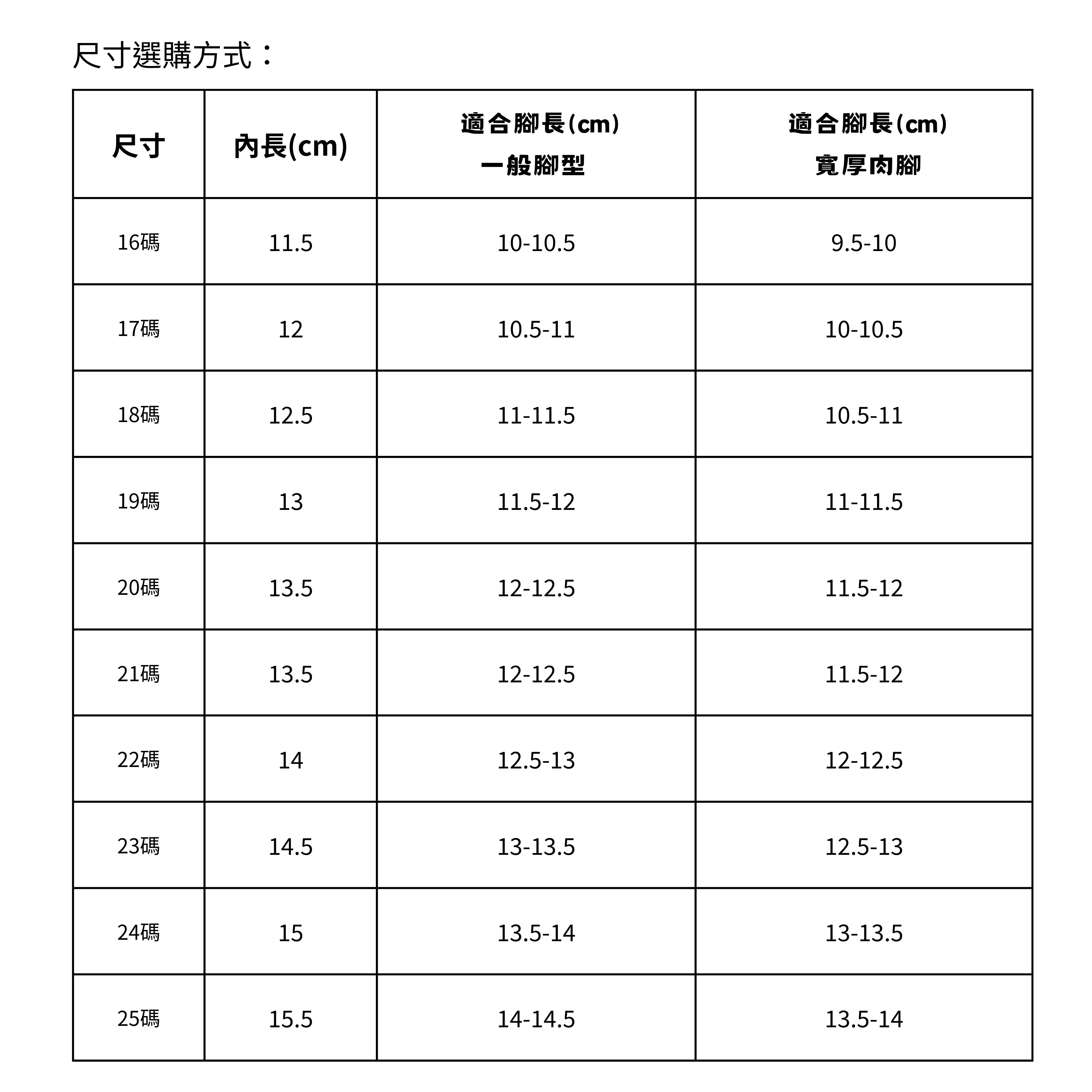 偏小版型,實際腳長+1~1.5cm=應選購內長,腳肉肉或腳板寬厚的寶貝+1.5~2cm選購內長