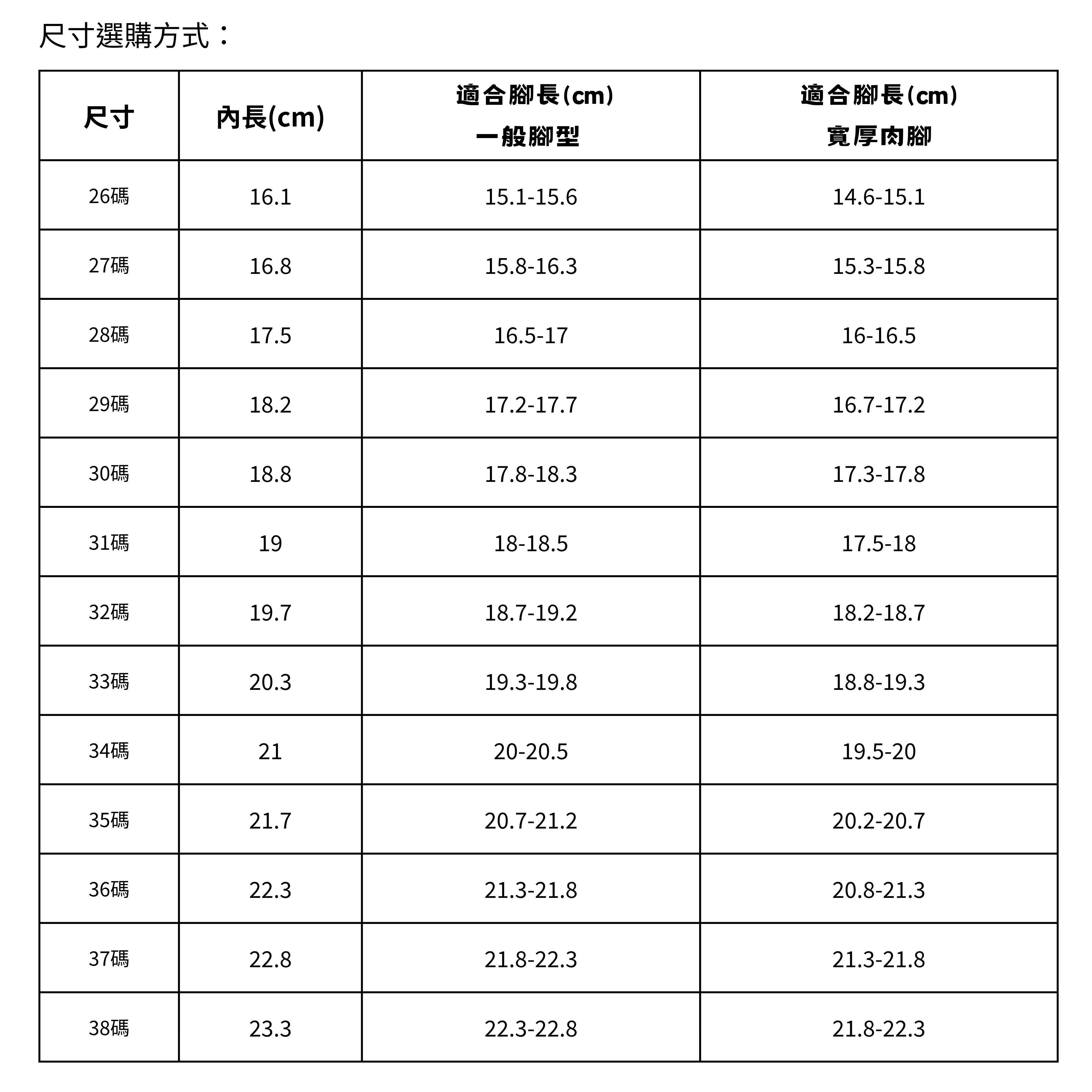 正常版型,實際腳長+0.5~1cm=應選購內長,腳肉肉或腳板寬厚的寶貝+1~1.5cm選購內長