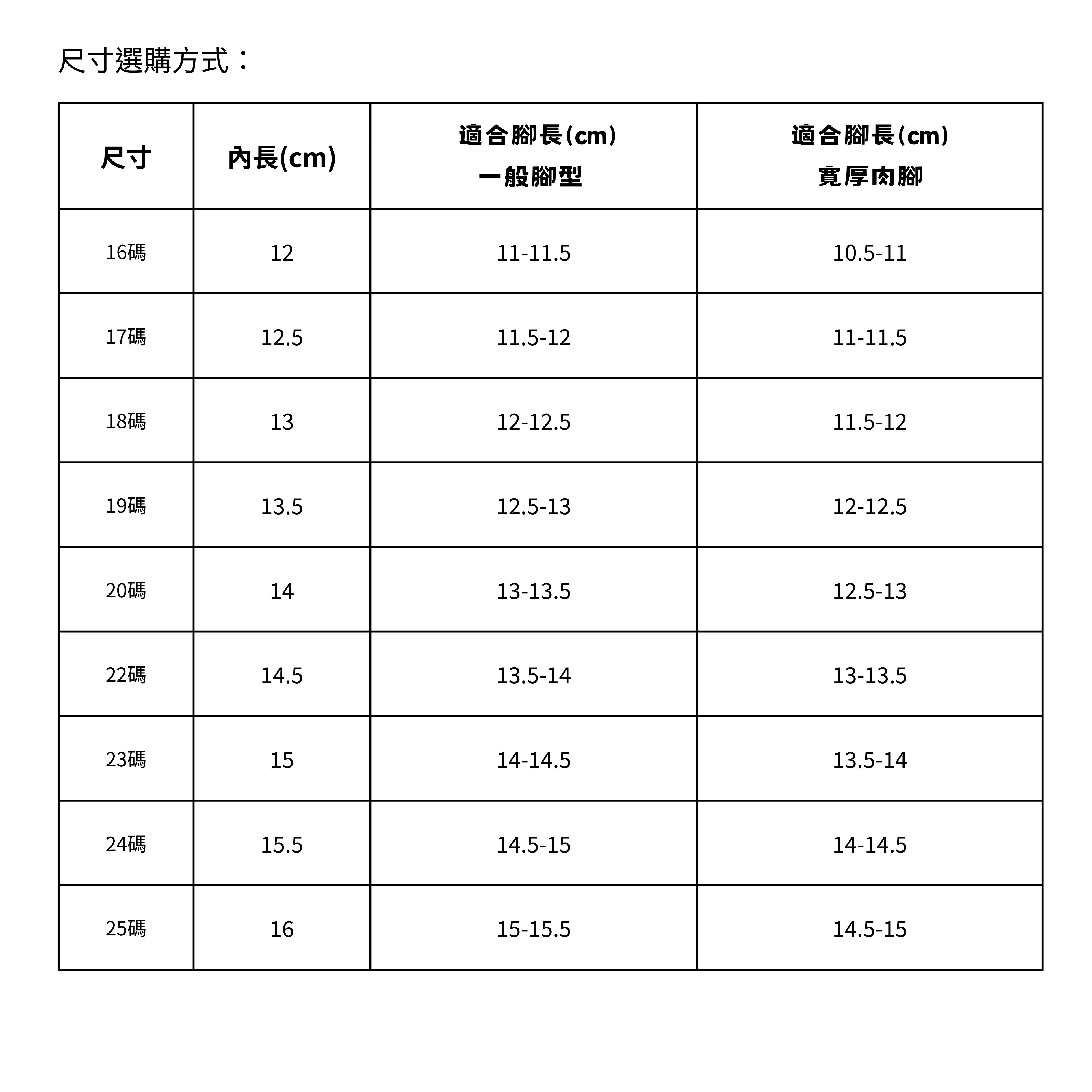 正常版型,實際腳長+0.5~1cm=應選購內長,腳肉肉或腳板寬厚的寶貝+1~1.5cm選購內長