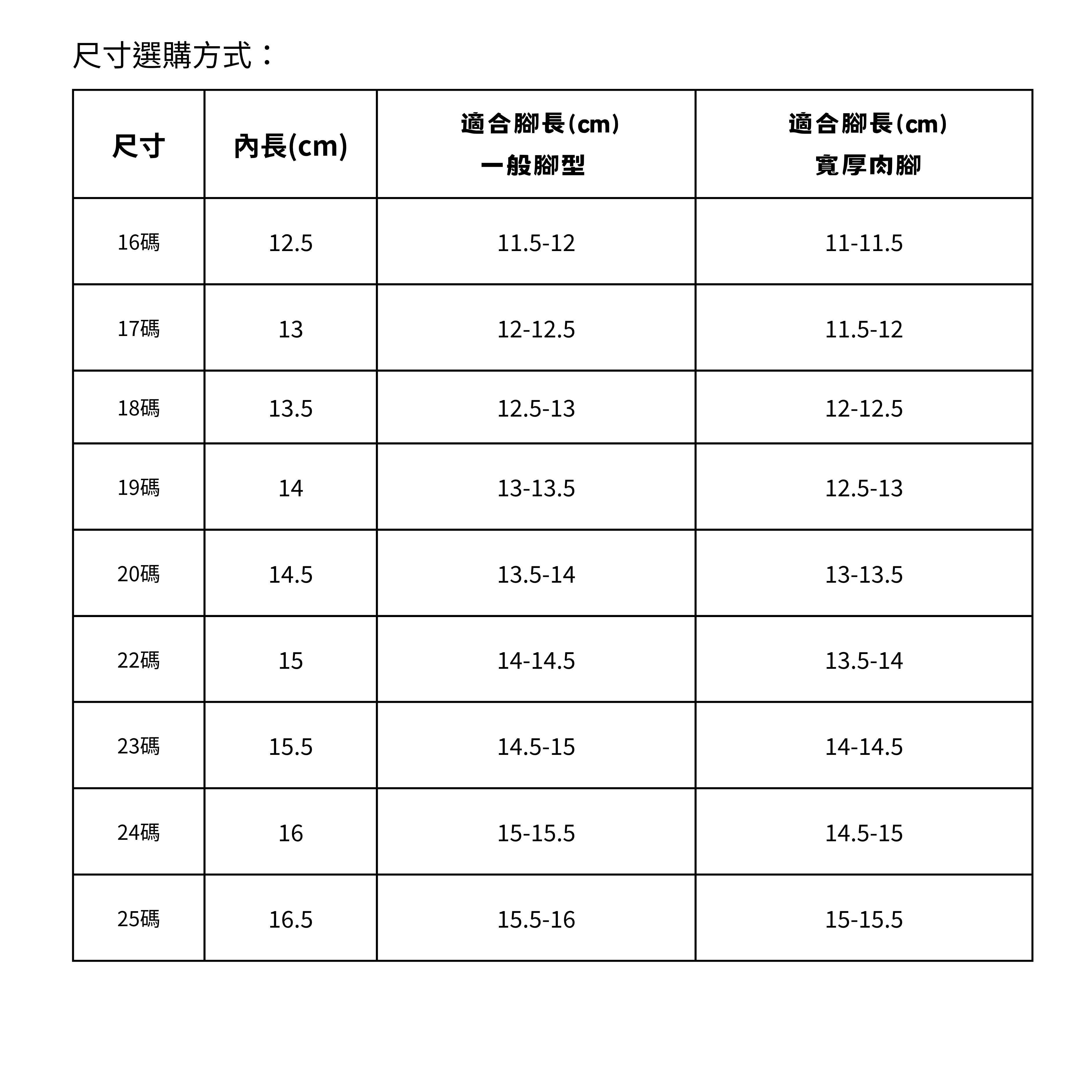 正常版型,實際腳長+0.5~1cm=應選購內長,腳肉肉或腳板寬厚的寶貝+1~1.5cm選購內長